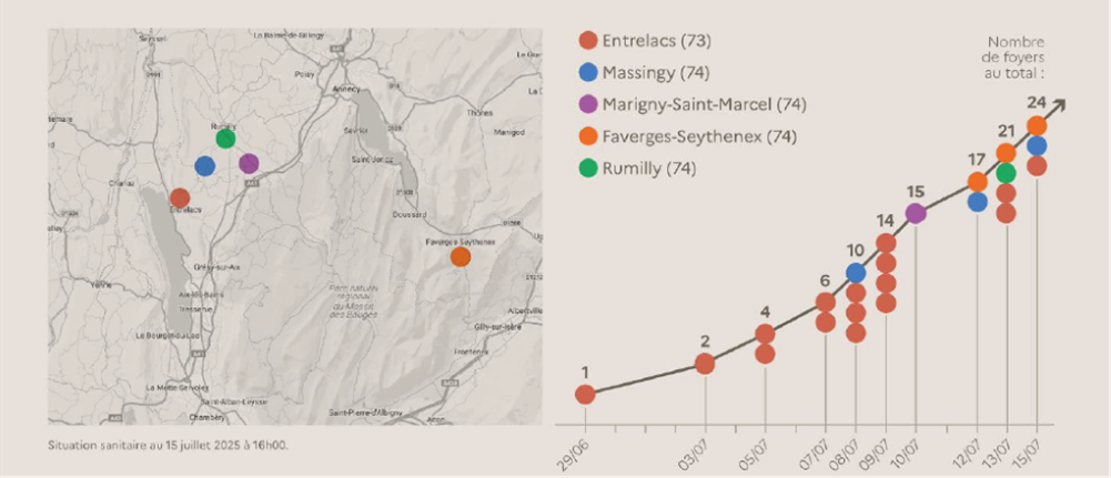 - Au 22/07/2025 : 33 foyers dans 23 élevages, répartis dans 7 communes en Savoie et Haute-Savoie (situation évolutive avec des suspicions en cours).