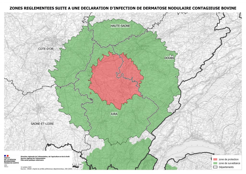 Le 11 octobre, un foyer de DNC a été confirmé dans le Jura. Il s’agit d’un élevage de 93 bovins. Cet élevage, situé en dehors de la zone réglementée définie jusqu’alors, conduit à délimiter une nouvelle zone réglementée concernant une partie des départements de Côte d’Or, du Doubs, du Jura,de la Haute-Saône, de Saône et Loire. Les mesures applicables dans cette zone sont prescrites par les arrêtés préfectoraux de chaque département,et sont applicables dès le 12 octobre 2025.Une campagne de vaccination obligatoire sera mise en œuvre dans cette zone. Informations complémentaires, cliquez ici.